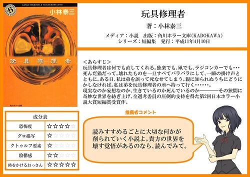紹介補足 クトゥルフ神話の伝道師と巷で噂の小林泰三先生のデビュー作。短編編小説「玩具修理者」と中編小説「酔歩する男」を収録。「玩具修理者」は第2回日本ホラー小説短編賞受賞作品。 読みどころ①SAN値が削れるッ!? 読む前に「小林泰三=クトゥルフ神…